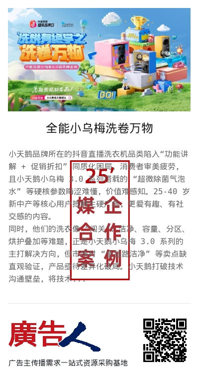 小天鹅品牌所在的抖音直播洗衣机品类陷入“功能讲解 + 促销折扣” 同质化困局,消费者审美疲劳,且小天鹅小乌梅 3.0 系列搭载的 “超微除菌气泡水” 等硬核参数晦涩难懂,价值难感知。25-40 岁新中产等核心用户抵触生硬广告,更爱有趣、有社交感的内容。