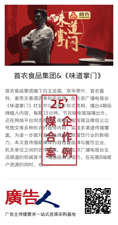首农食品集团旗下白玉豆腐、京华茶叶、首农畜牧、麦壳天香酒店等知名品牌,在北京广播电视台《味道掌门》栏目中以纪录片形式亮相,播出4期品牌植入内容,每期15分钟。节目除电视端播出外,还在网络平台同步推出长视频、短视频及微信公众号图文等多种形式的宣传内容,实现多渠道传播覆盖。