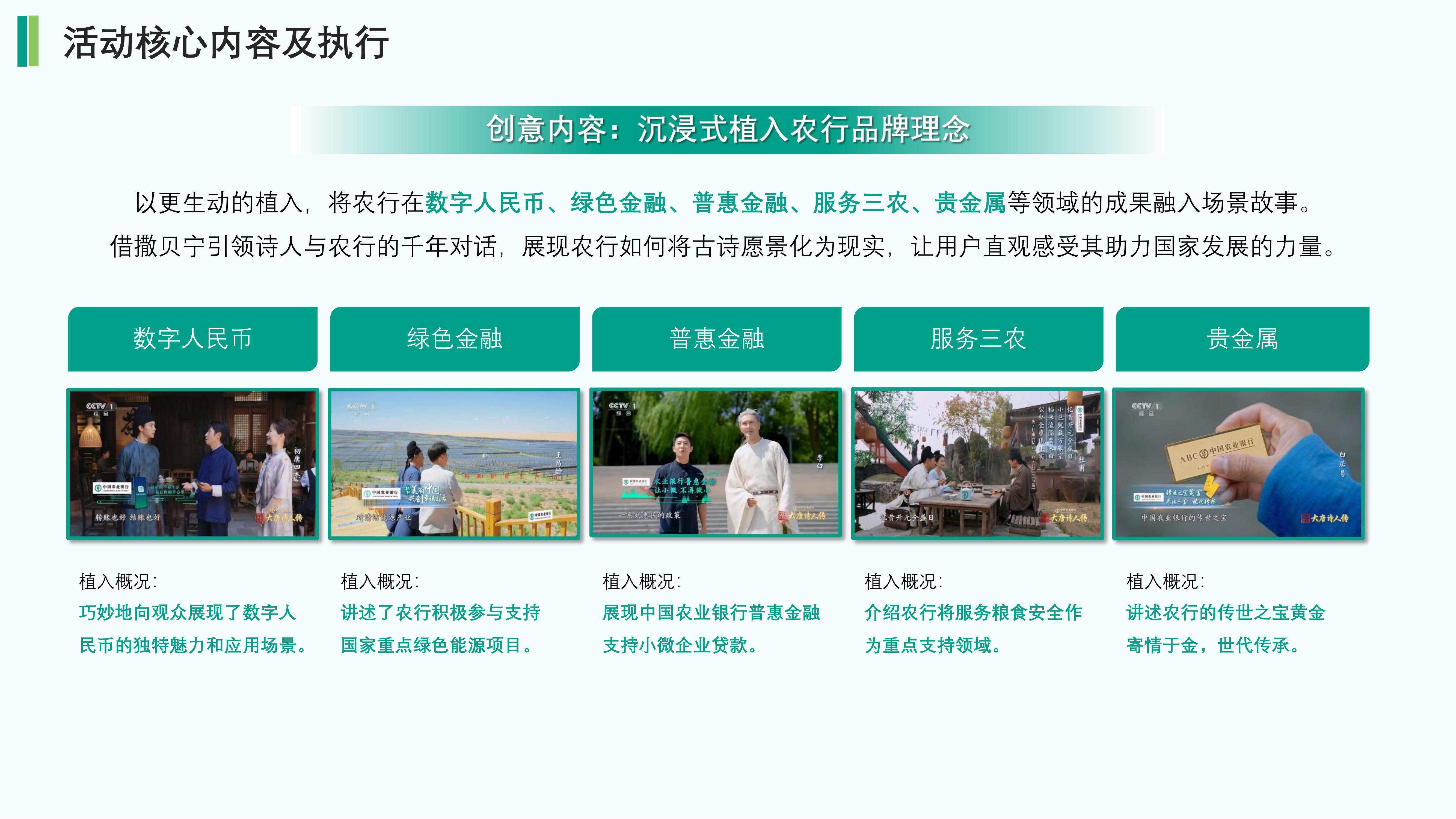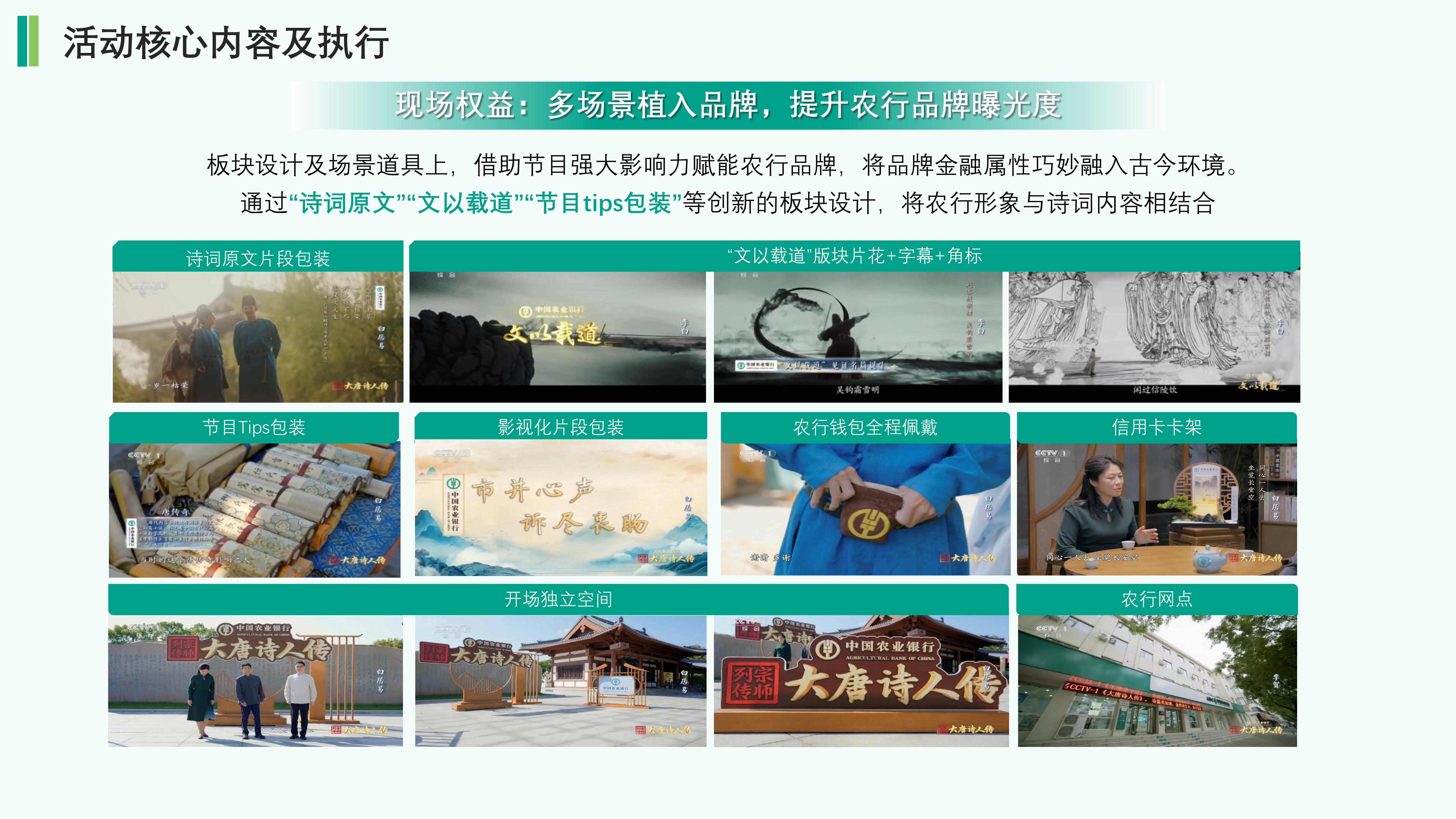 活动核心以 “唐诗文化解码 + 品牌价值具象化” 为主线。板块设计及场景道具上,借助节目强大影响力赋能农行品牌,将品牌金融属性巧妙融入古今环境。