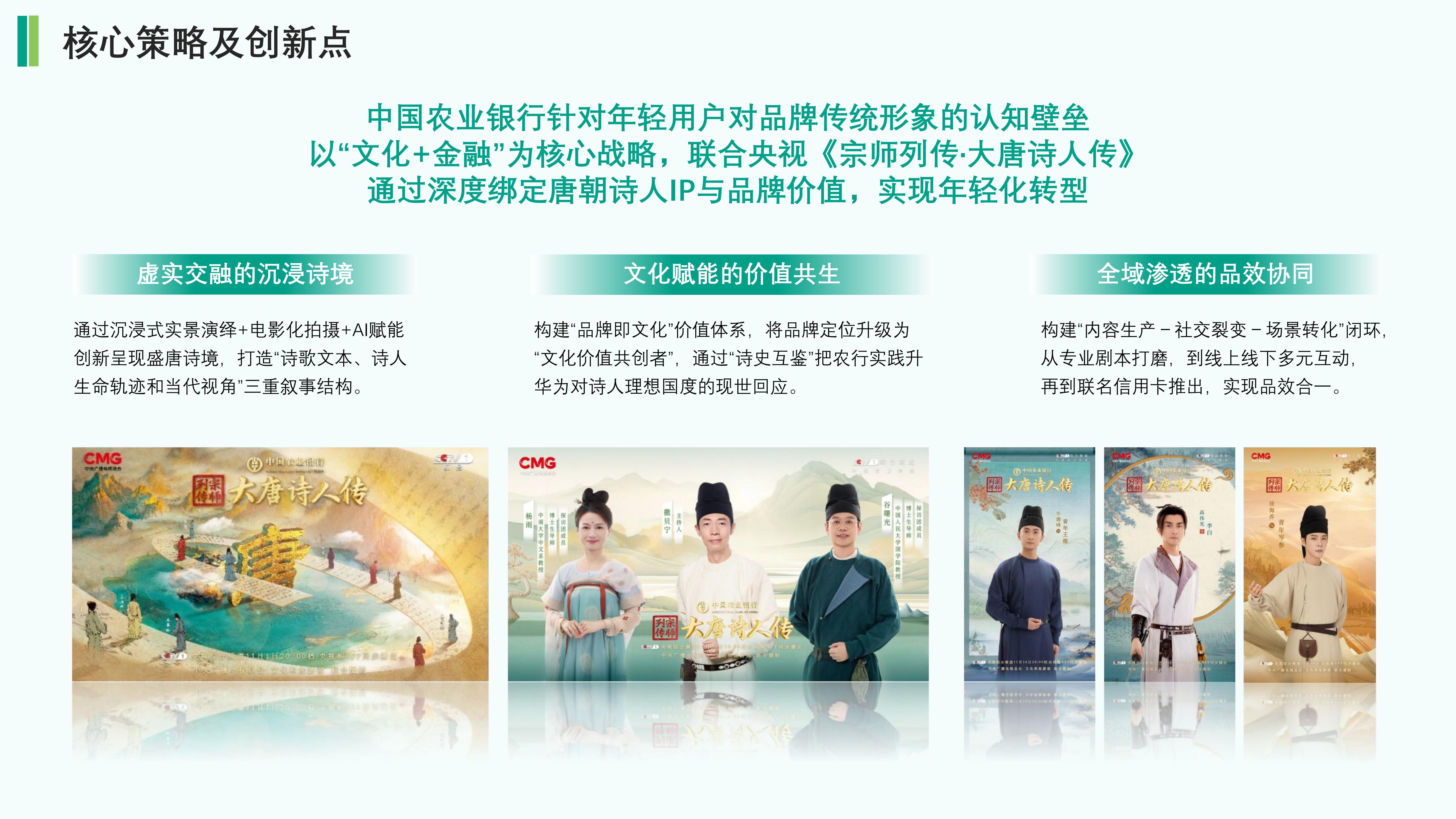以“文化+金融”为核心战略,联合央视《宗师列传·大唐诗人传》通过深度绑定唐朝诗人IP与品牌价值,实现年轻化转型。
