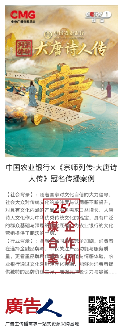 农行选择冠名《宗师列传·大唐诗人传》提出“唐诗里的中国梦”作为此次IP营销的主题将传统文化与现代元素融合。