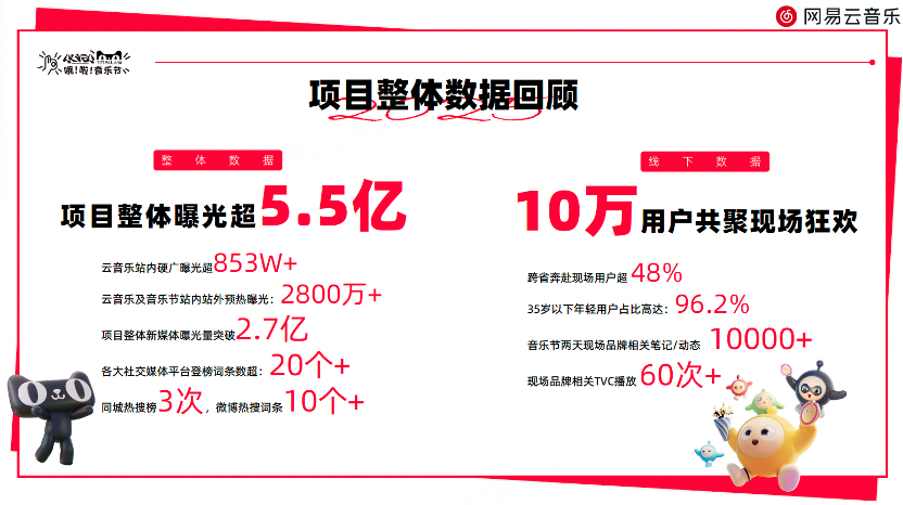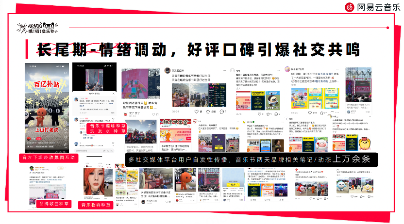 我们构建了 “预热造势、引爆沉浸、长尾共鸣” 的传播节奏。以网易云音乐为主阵地,联动站内硬广、艺人矩阵和社群资源进行精准预热;在线下音乐节现场打造极致品牌体验,创造海量可传播内容;最终通过用户的自主分享和社交热搜,形成持续不断的长尾声浪,实现从圈层到破圈的链式反应。
