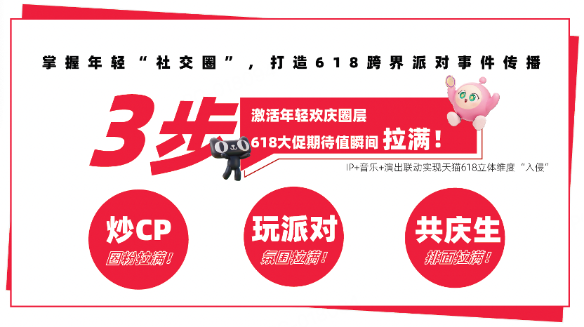 大胆构想:让天猫618成为一场全国年轻人争相打卡的生日派对! 我们为虚拟偶像“猫天天”和“蛋仔”打造了破次元的CP故事线,并将音乐节现场变为派对的实体狂欢场。通过魔性主题曲、IP巡游、艺人空降惊喜和深度互动的品牌集市,让每一个环节都充满分享欲,让品牌信息在快乐中被“种草”