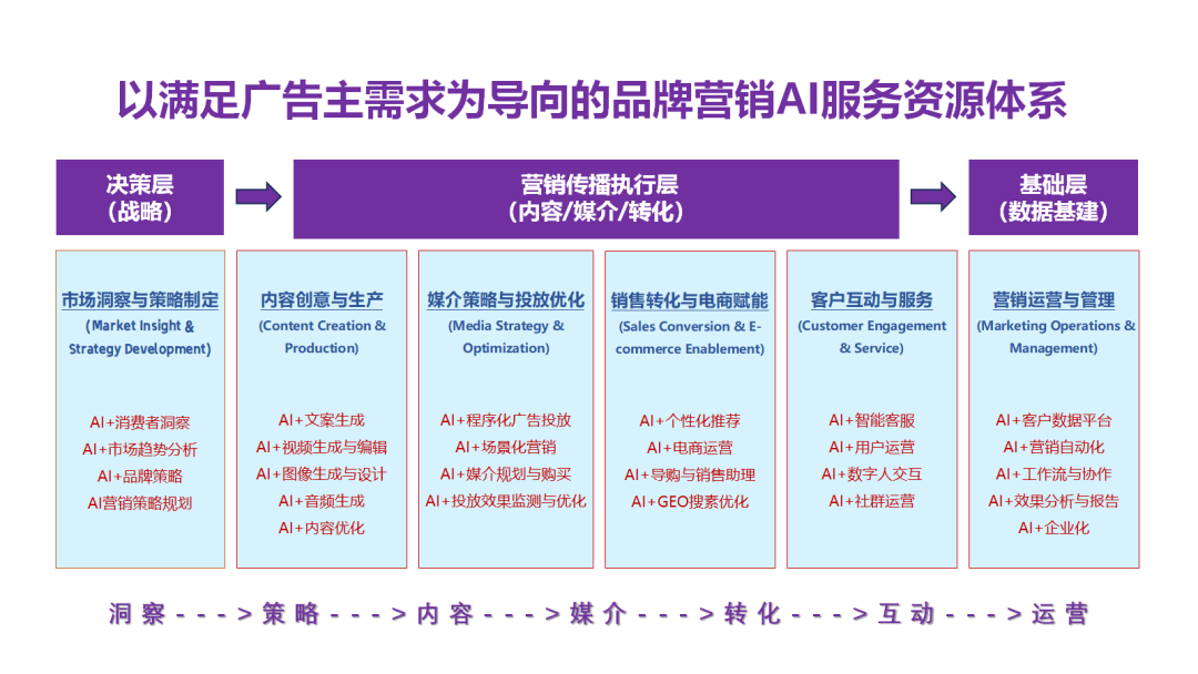 其中,战略决策层以高端智慧服务赋能品牌,通过AI+消费者洞察、AI+品牌策略规划等模块,为广告主提供精准市场洞察与策略规划;运营执行层覆盖内容生成、媒介投放、销售转化、客户互动四大核心执行模块,助力营销落地效率提升;基础层则依托AI+客户数据平台、AI+营销自动化等技术服务,提供数据底层支持与管理系统保障。