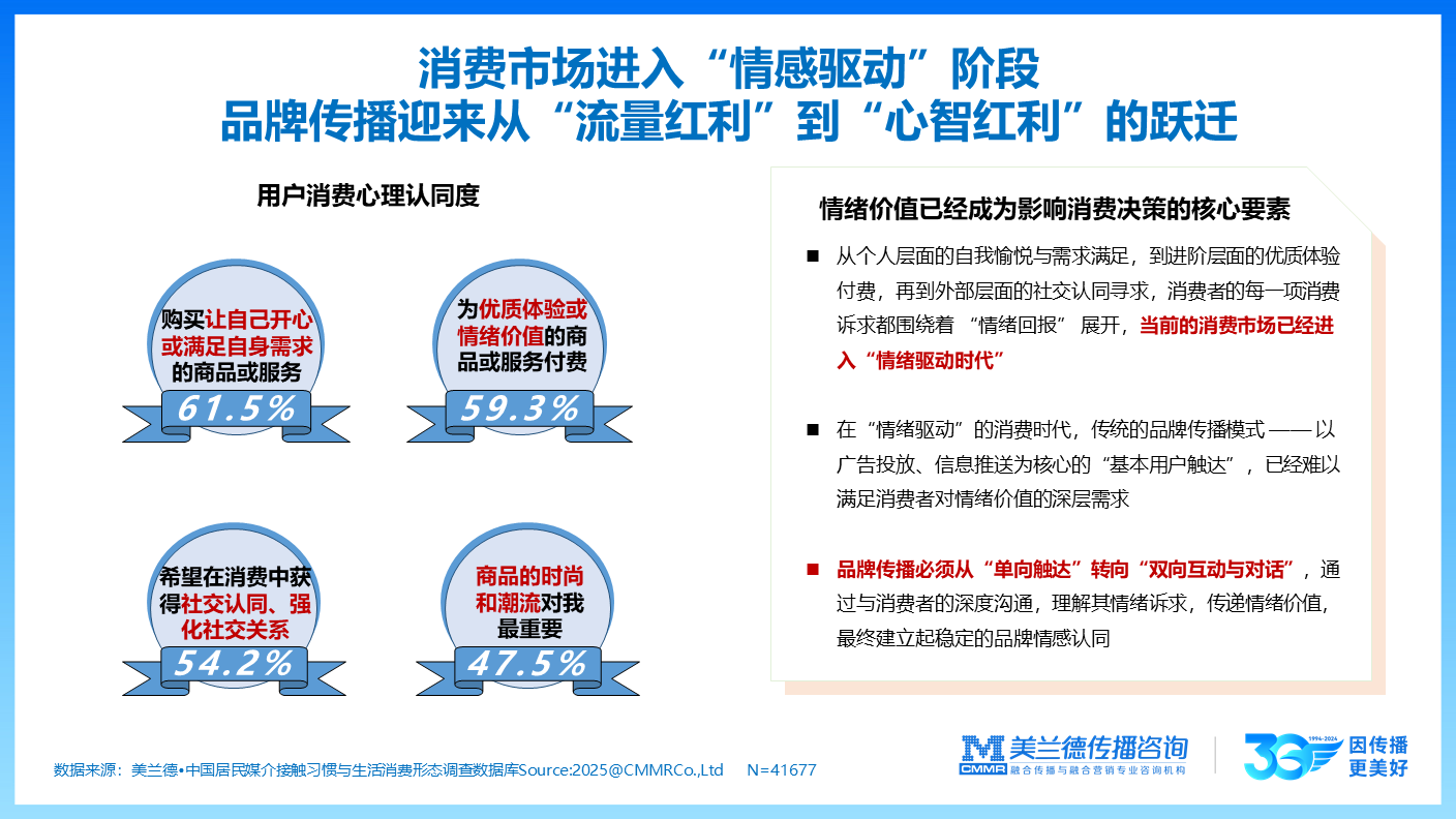 从受众与消费端来看, 消费者不只依赖于物质满足需要,情感链接与价值共鸣成为营销新锚点。消费市场进入“情感驱动”阶段,品牌传播迎来从“流量红利”到“情感红利”的变迁。美兰德咨询2025中国居民媒介接触习惯与生活消费形态调查数据显示:在用户消费心理认同上,购买让自己开心或满足自身需求的商品或服务认同度达61.5%,为优质体验或情绪价值的商品或服务付费认同度59.3%,希望在消费中获得社交认同、强化社交关系认同度54.2%。聚焦品牌心智营销实践,产品功能情绪化成为营销核心竞争力,共创感成为品牌生存新内核。