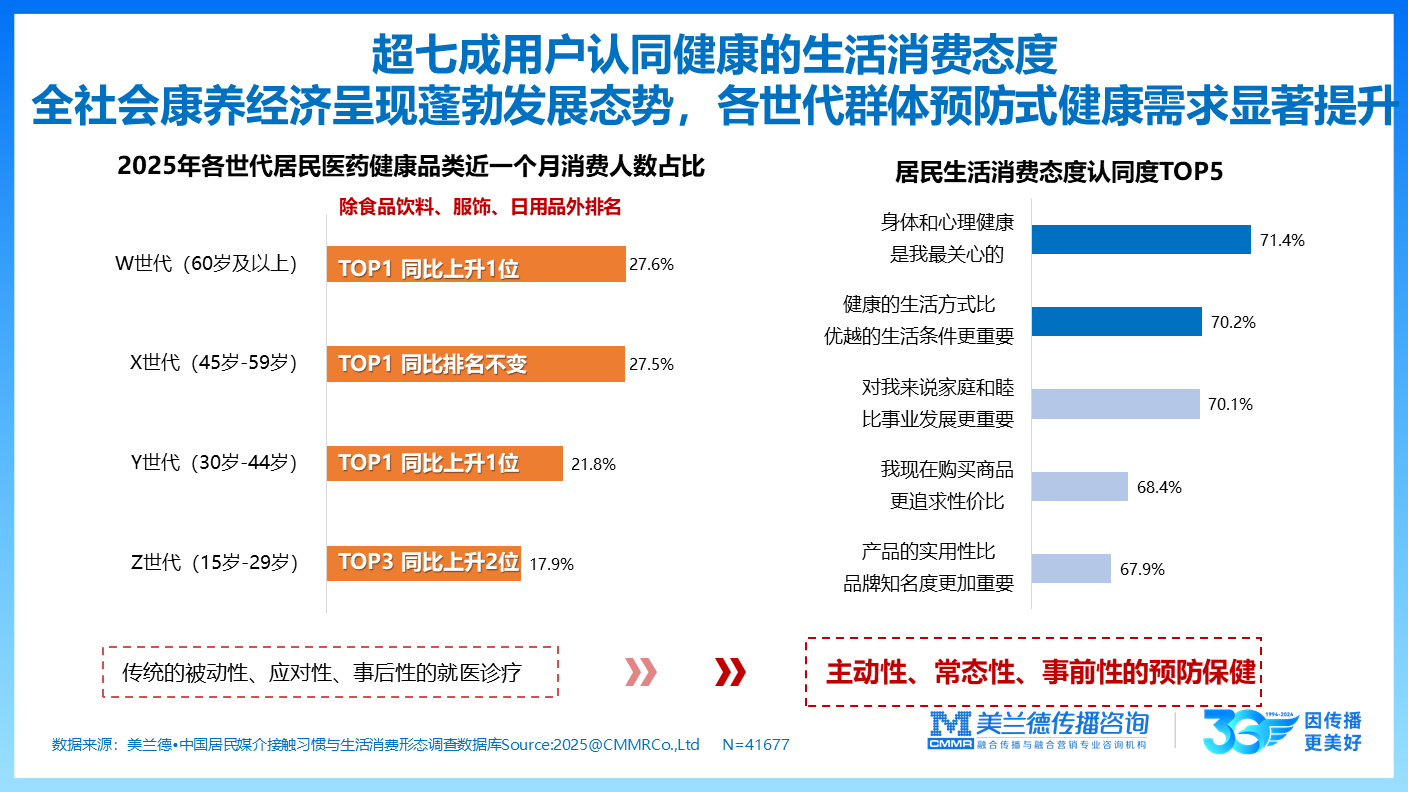 银发经济与健康消费双轮驱动下,大健康产业成为社会发展硬刚需与国民经济新增长点。美兰德咨询2025中国居民媒介接触习惯与生活消费形态调查数据显示:超七成用户认同健康的生活消费态度,全社会康养经济呈现蓬勃发展态势,各世代群体预防式健康需求显著提升。2025年各世代居民医药健康品类(除食品饮料、服饰、日用品外)近一个月消费人数中,W世代(60岁及以上)占比达27.6%,位列各年龄世代第一,排序其次为X世代(45岁~59岁)。