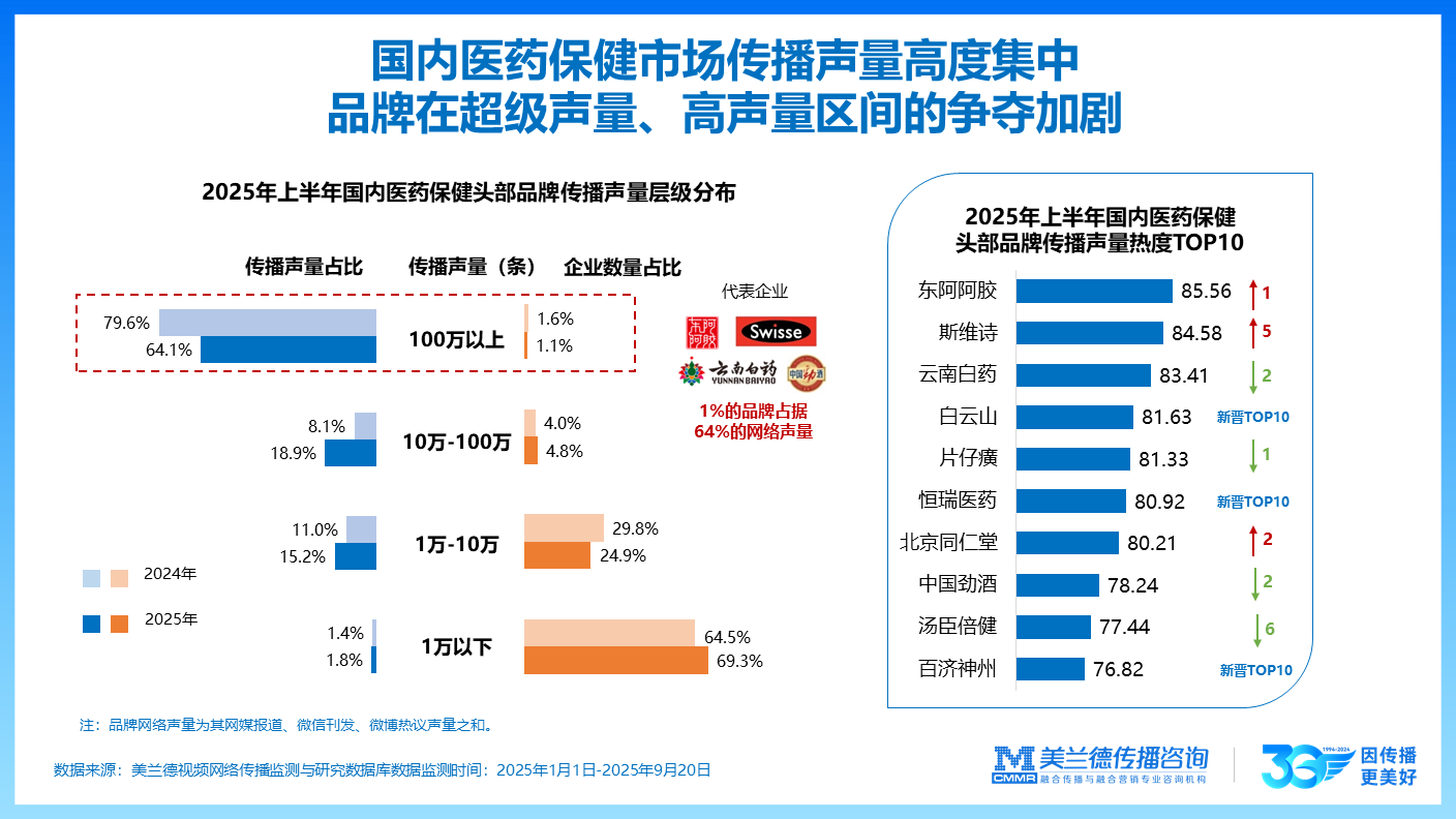 从声量来看,国内医药保健市场传播声量高度集中,品牌在超级声量、高声量区间的争夺加剧。美兰德咨询2025融合传播监测数据显示:2025年上半年国内医药保健头部品牌传播声量层级分布中,占比1.6%的企业数量传播声量占比达79.6%;占比69.3%的企业数量传播声量仅占1.8%。2025年上半年国内医药保健头部品牌传播声量热度前五名(均达亿次级别)为:东阿阿胶、斯维诗、云南白药、白云山与片仔癀。