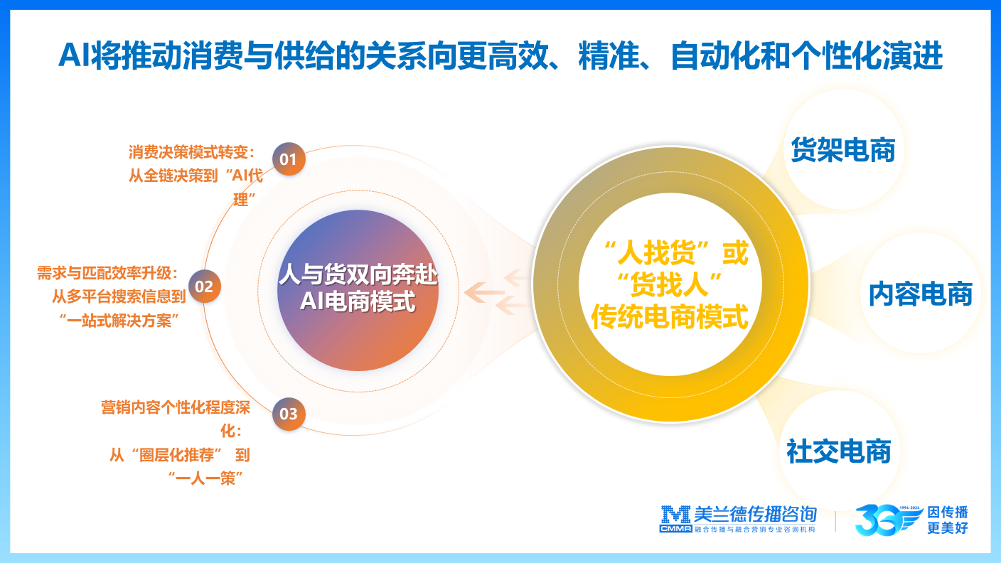 未来,在智能化科技的深度影响下,AI将推动消费与供给的关系向更高效、精准、自动化和个性化的方向演进。AI将推动“人货场”关系的再重构。从传统的货架、内容、社交电商模式到AI电商模式,未来用户的消费决策模式将发生变化,实现从全链决策向AI代理模式转变;消费需求与匹配效率将进一步升级,从多平台搜索信息到AI一站式高效提出解决方案;营销内容的个性化程度亦会深化,从社群圈层化推荐到“一人一策”、更懂你的AI智能化定制服务。