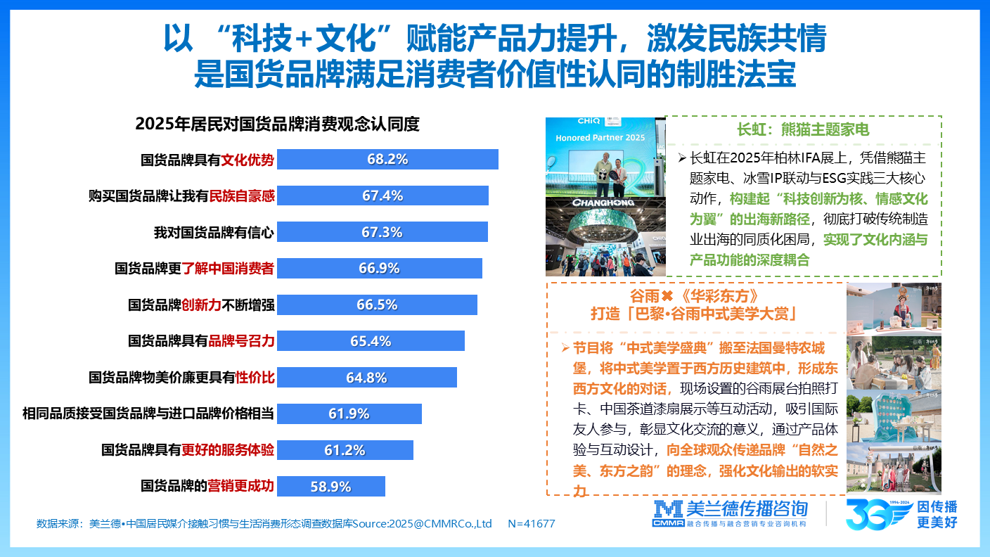 在实践层面,国货品牌以“科技与文化”为抓手赋能产品力,更能精准激发民族共情,实现情绪价值从个体到群体的升维传递:长虹在2025年柏林IFA展上,通过熊猫主题家电、冰雪IP联动与ESG实践的“科技与文化”组合拳,打破传统制造业出海的同质化困局,让文化内涵与产品功能深度耦合,唤起消费者对民族品牌科技创新与文化表达的双重认同。