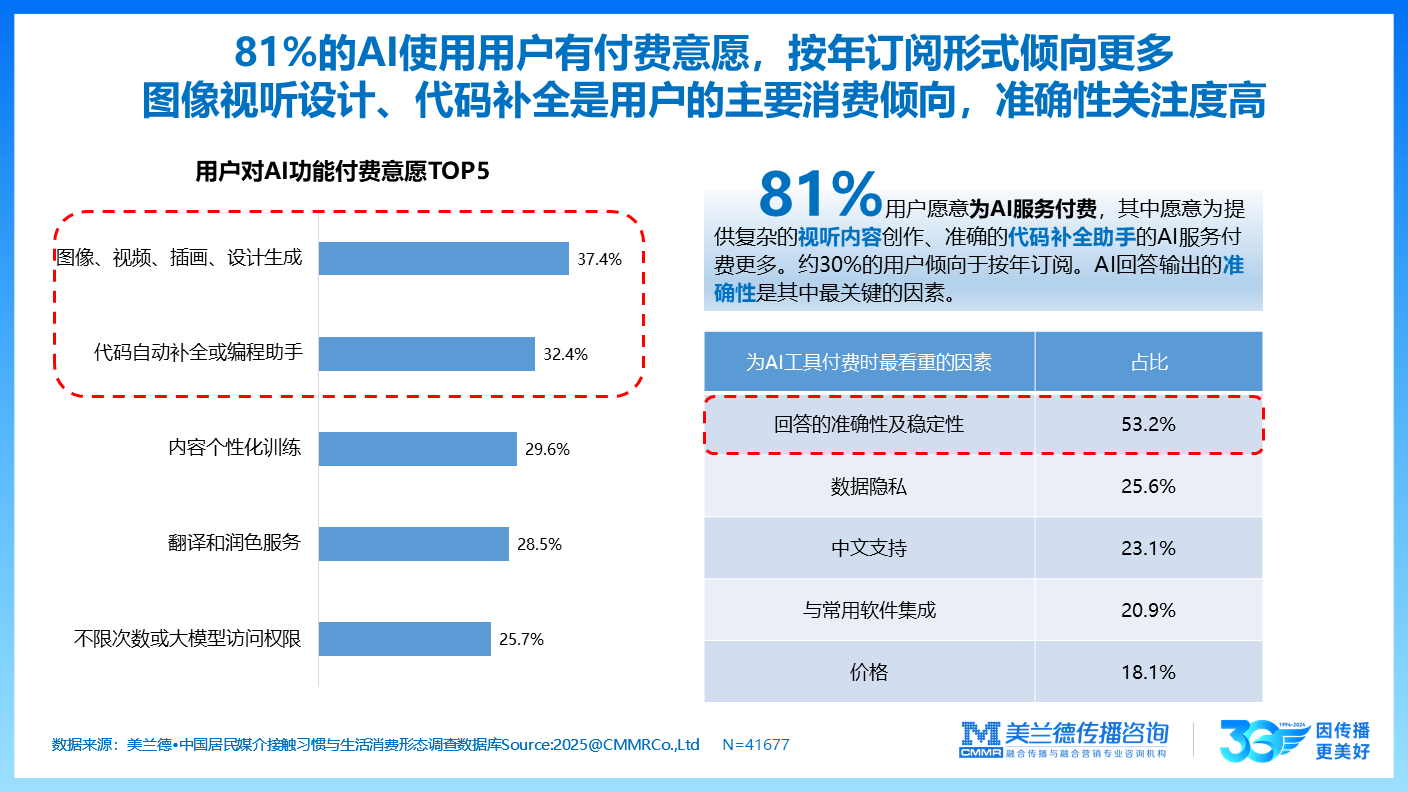 用户对AI的效率、便利呈现较高接受度,可靠性、稳定性有提升空间。81%的AI使用用户有付费意愿,按年订阅形式倾向更多,图像视听设计、代码补全是用户的主要消费倾向,准确性关注度高。