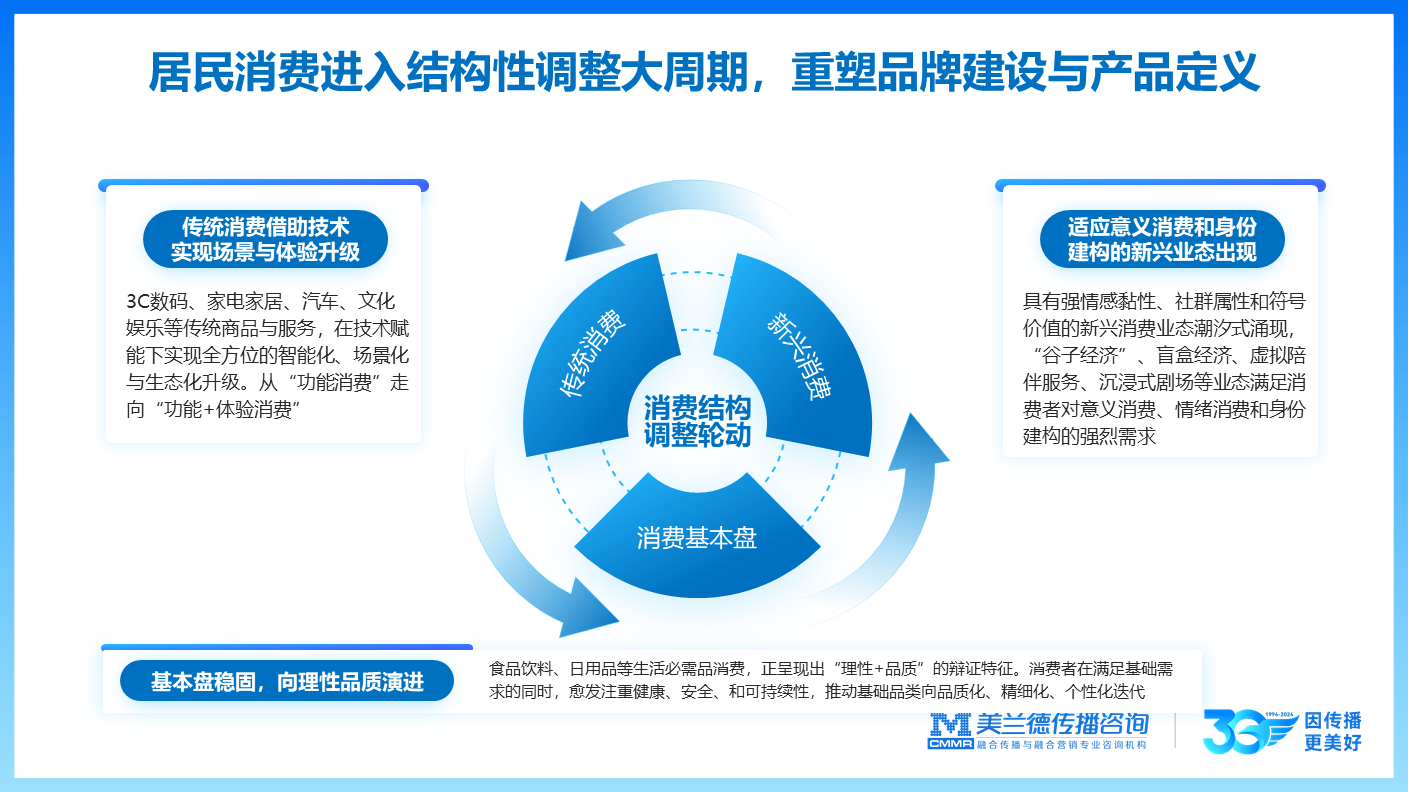当前,居民消费进入结构性调整大周期,国民经济的消费基本盘、传统消费与新兴消费形态正涌现出多样的特征变化与迭代。具体来看: