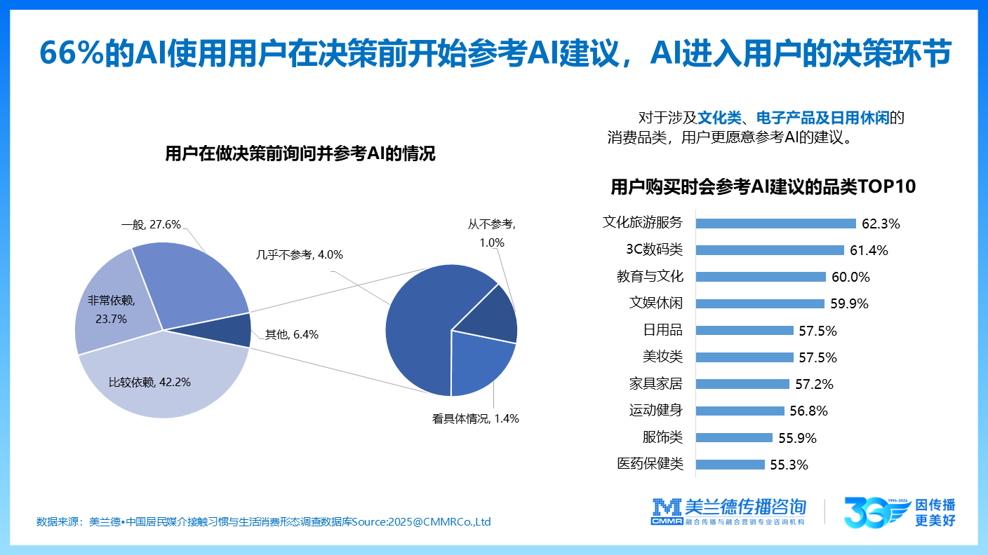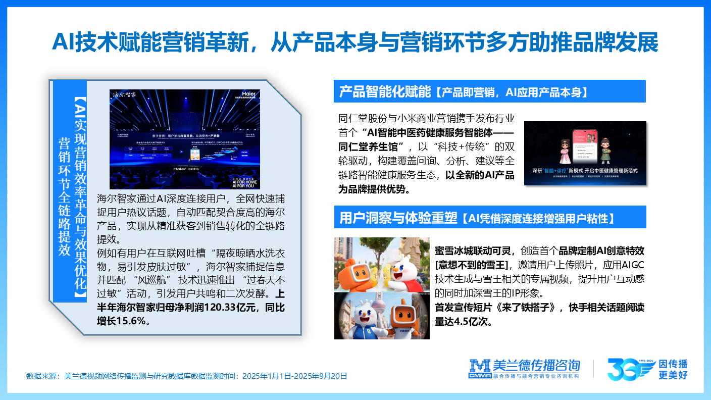 AI技术正从产品与营销两端驱动品牌革新,实现全链路提效。海尔智家通过AI实时捕捉用户需求,精准匹配产品并推动活动转化,助力其上半年归母净利润同比增长15.6%;同仁堂联合小米打造“AI智能中医药健康服务智能体”,以“科技与传统”融合构建健康服务新生态,实现“产品即营销”;蜜雪冰城则借助AIGC特效互动,强化用户参与及IP形象,相关话题阅读量达4.5亿次。AI已深度融入用户洞察、内容创新与产品智能化,成为品牌增长的重要引擎。