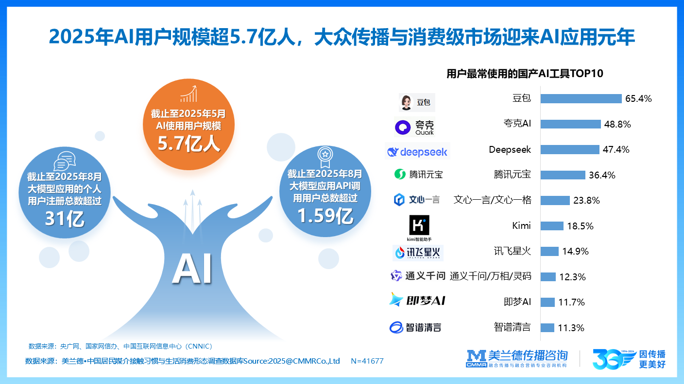 2025年,中国正式步入大众传播与消费级市场的“AI应用元年”,其标志性特征便是用户规模的爆发式增长。权威数据显示,截至2025年8月,国内大模型应用的累计个人用户注册总量已突破31亿;另据国家网信办与中国互联网信息中心(CNNIC)统计,至2025年5月,我国AI活跃用户规模已高达5.7亿人,充分印证了AI技术普及的广度与深度。在这一浪潮中,国产AI工具迅速占领市场主流。根据美兰德2025年度中国居民媒介接触与生活消费形态调研数据显示,豆包、夸克AI、Deepseek、腾讯元宝、文心一言已位列全国居民最常使用的国产AI工具前五强,凸显出国产品牌在激烈的市场竞争中已赢得显著的用户市场份额。