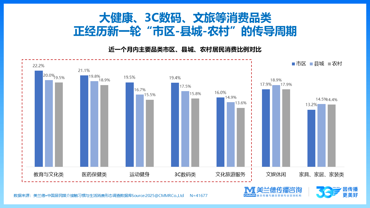 从消费地区结构来看, 大健康、3C数码、文旅等消费品类正经历新一轮“市区—县城—农村”的传导周期。经济波动背景下市区及县城年轻用户消费态度分流,品牌基于不同区域“心智市场”的差异化价值主张的重要性凸显。从近一个月消费数据看,市区在教育与文化类(22.2%)、医药保健类(21.1%)等多数品类消费比例领先,彰显市区消费市场的成熟与活力。县城消费紧随其后,如教育与文化类达20.0%、医药保健类19.8%,体现出县城消费市场对市区的紧密承接。农村消费虽整体比例稍低,但也保持一定热度,如教育与文化类为9.5%、医药保健类18.9%等,显示出农村消费市场的潜力。这一传导周期的出现,既源于市区消费升级的带动,也得益于县域、农村地区消费能力的逐步提升以及消费观念的转变,未来这些消费品类在不同区域的发展值得持续关注。