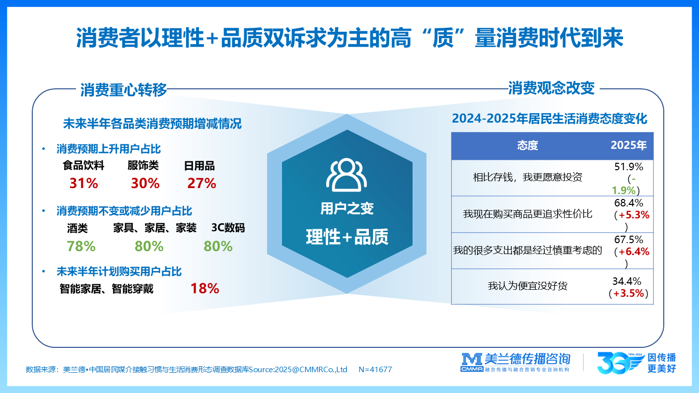 从消费心理来看, 消费者以理性与品质双诉求为主的高“质”量消费时代到来。美兰德咨询2025中国居民媒介接触习惯与生活消费形态调查数据显示:未来半年食品饮料、服饰与日用品消费预期上升用户占比分别为31%、30%与27%;计划购买智能家居、智能穿戴设备的用户占比达到18%。例如,78.9%的用户相较于传统设备更愿选择智能化设备,更具品质和科技感的智能化3C产品正主导市场发展方向。