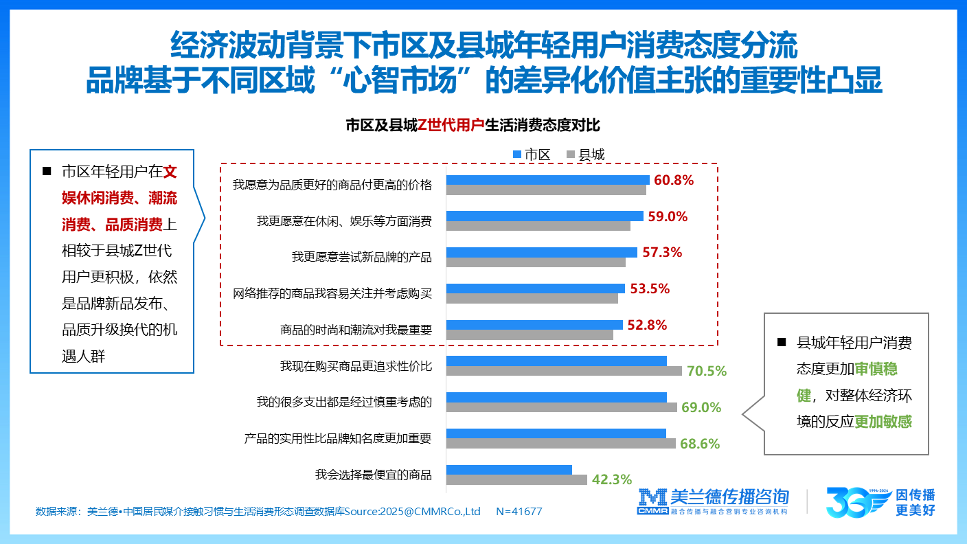 经济波动背景下市区及县城年轻用户消费态度分流。 品牌基于不同区域“心智市场”的差异化价值主张的重要性凸显。市区年轻用户在文娱休闲消费、潮流消费、品质消费上相较于县城Z世代用户更积极,依然是品牌新品发布、品质升级换代的机遇人群。县城年轻用户消费态度更加审慎稳健,对整体经济环境的反应更加敏感。