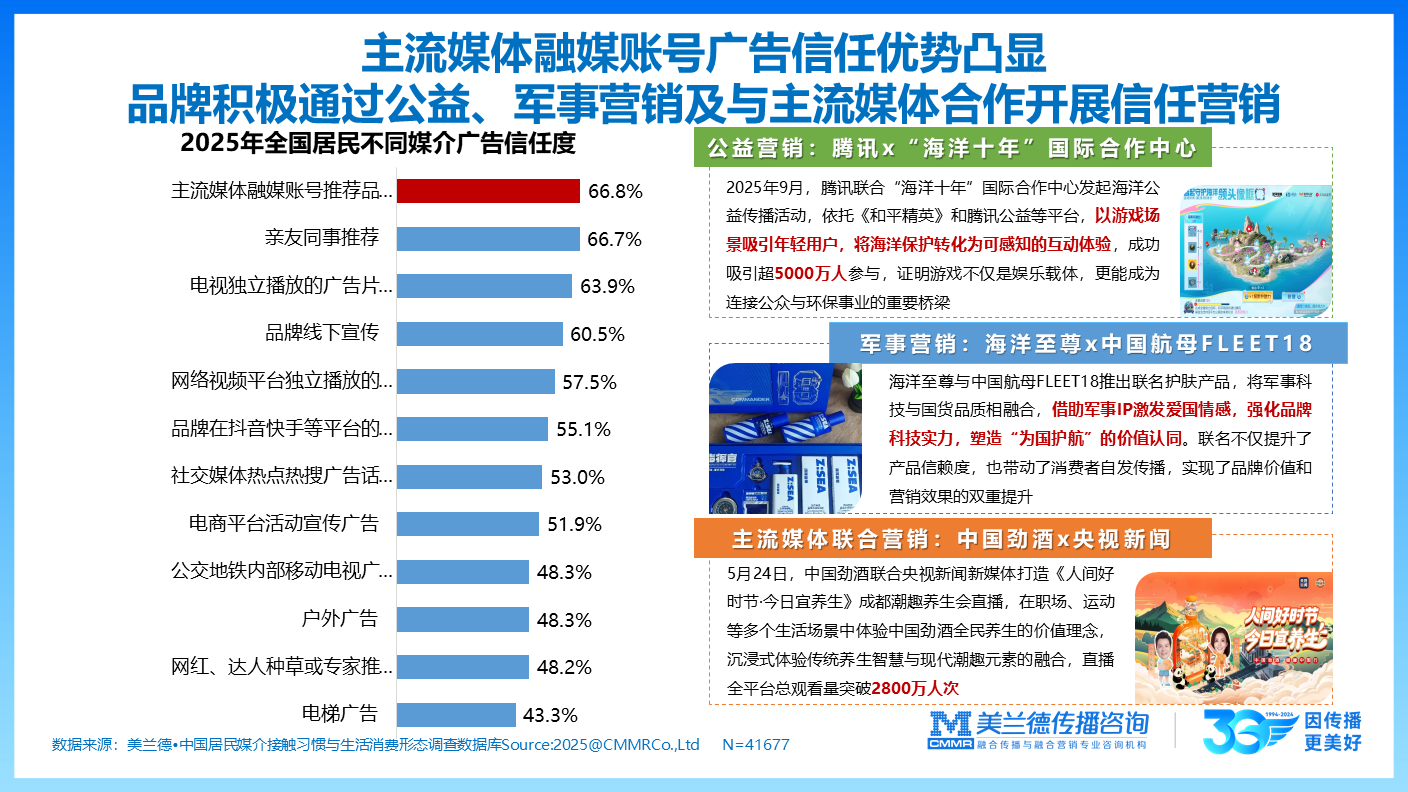 信任营销在当下碎片化的传播环境下已成为心智营销中不可或缺的关键环节。 从2025年全国居民不同媒介广告信任度数据来看,主流媒体融媒账号推荐的广告以66.8%的信任度位居榜首,显著凸显出主流媒体在受众心中天然的信任优势,为品牌开展信任营销筑牢了认知基础。