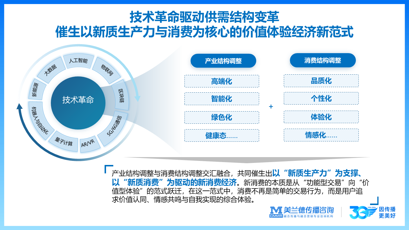 在过去的两三年时间里,我们深刻感受到,整个经济和消费市场都发生了显著变化。技术革命驱动供需结构变革,产业结构调整与消费结构调整交汇融合,共同催生出以“新质生产力”为支撑、以“新质消费”为驱动的新消费经济。新消费的本质是从“功能型交易”向“价值型体验”的范式跃迁,在这一范式中,消费不再是简单的交易行为,而是用户追求价值认同、情感共鸣与自我实现的综合体验。产业结构调整主要呈现高端化、智能化、绿色化与健康化特征;消费结构调整亦呈现出品质化、个性化、体验化与情感化的典型需求特征。