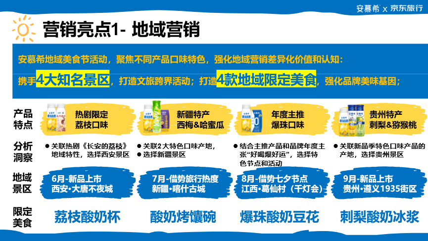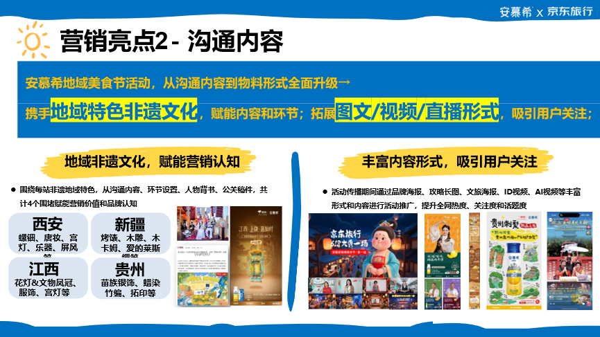 2025年,安慕希 X 京东旅行继续再携手开展创新场景的文旅跨界整合营销,持续升级和深化【安慕希地域美食节】营销IP。立足年轻用户群体以及旅行人群洞察,围绕旅行场景和健康品质生活方式,结合地域美食&在地文化&非遗技艺,聚焦安慕希阶段核心产品,打造一场持续4个月,贯穿陕西、新疆、江西、贵州四城四地的美味与文化的跨界整合营销活动!