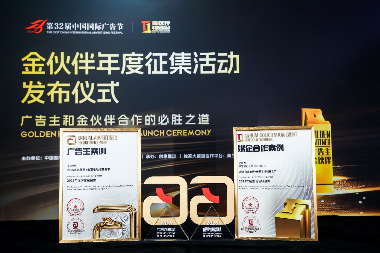 10月25日,第32届中国国际广告节·金伙伴年度征集活动发布仪式,在北京中关村国际创新中心隆重举行。本次发布仪式上,京东旅行与安慕希联合选送的2025安慕希地域美食节整合营销项目,凭借清晰的策略逻辑、创新的执行思路与显著的市场实效,获颁媒企合作案例“年度整合营销金案”称号。