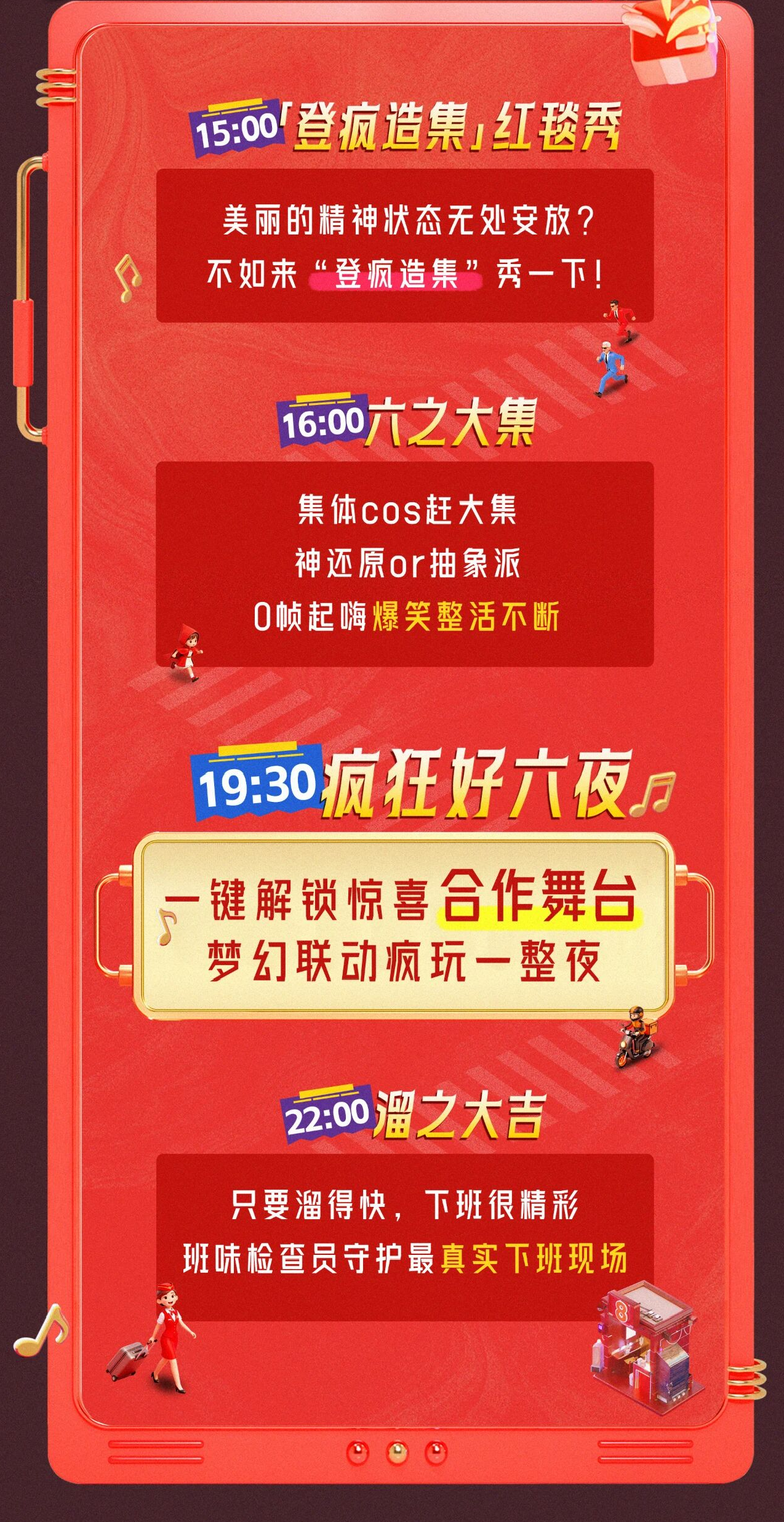 从“妈妈出道秀”到“四季情歌秀”,从“热梗整活秀”到“姐棣斗舞秀”,天猫依托“疯狂好六夜”将内容沉淀为圈层文化,用潮流热梗唤起受众共有的媒介记忆。在互动环节,天猫设置“都市丽人礼”、“打工回血礼”、“阿贝贝好礼”、“我爱我车礼”、“宅人快乐礼”、“苦gym甘来礼”六大好礼相送,无论是“精致妈妈”还是“打工青年”,让每个受众都能找到内容亮点与情绪支点。天猫与用户玩在一起,用潮流文化嵌入用户社交。“爆疯突袭秀”“快乐OK秀”等系列节目将天猫的营销思维与年轻化实践完美诠释,观众在啼笑皆非间记住了何老师被唱“躺下”的名场面,也记住了天猫的促销内容。