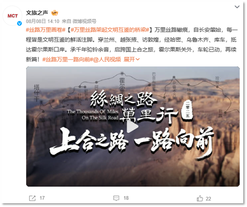 活动期间,全网累计阅读量突破 26.36亿,微博平台共产生 427次热搜,在榜时长超195小时,话题词 #丝路万里一路向前# 阅读量达 3.5亿。抖音平台相关话题播放量超1亿次,视频号《2025丝绸之路万里行》热门短视频互动10万次,形成立体化、多层次的传播矩阵。