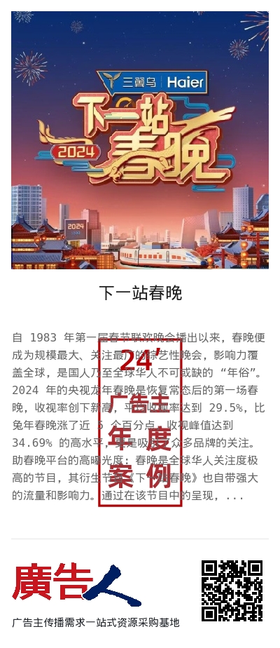自 1983 年第一届春节联欢晚会播出以来,春晚便成为规模最大、关注最广的综艺性晚会,影响力覆盖全球,是国人乃至全球华人不可或缺的 “年俗”。2024 年的央视龙年春晚是恢复常态后的第一场春晚,收视率创下新高,平均收视率达到 29.5%,比兔年春晚涨了近 5 个百分点,收视峰值达到 34.69% 的高水平,更是吸引了众多品牌的关注。