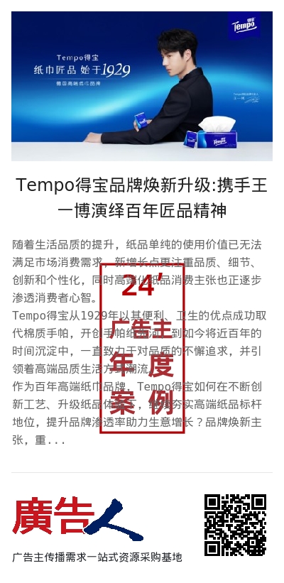 源于对高端品位和匠心沉淀的不谋而合,Tempo得宝牵手品牌代言人、青年演员王一博,焕新品牌新主张、升级经典系列为消费者带来纸巾匠品。希望借助明星势能撬动品牌势能,全域推动品牌声量及销量的爆发。