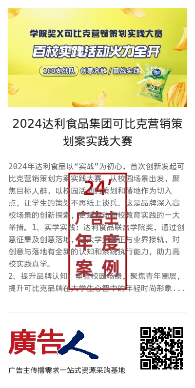 2024年达利食品以“实战”为初心,首次创新发起可比克营销策划方案实践大赛。从校园场景出发,聚焦目标人群,以校园活动的策划和落地作为切入点,让学生的策划不再纸上谈兵。这是品牌深入高校场景的创新探索,更是驱动高校教育实践的一大举措。