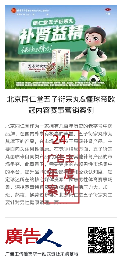 北京同仁堂五子衍宗丸主要针对男性健康调理。而体育赛事和球迷文化则是现代社会中充满活力的领域。体育运动与男性群体有着密切的联系,因此五子衍宗丸的目标消费群体与体育迷高度重合。通过深度与球赛垂直头部男性集中平台捆绑,不仅可以进一步提升品牌知名度和影响力,还可以进一步拓展市场份额。