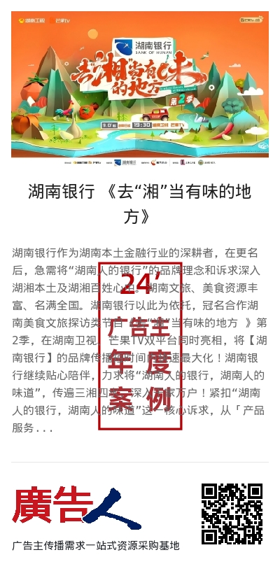 湖南银行作为湖南本土金融行业的深耕者,在更名后,急需将“湖南人的银行”的品牌理念和诉求深入湖湘本土及湖湘百姓心中。湖南文旅、美食资源丰富、名满全国。湖南银行以此为依托,冠名合作湖南美食文旅探访类节目《去“湘”当有味的地方 》第2季,在湖南卫视、芒果TV双平台同时亮相,将【湖南银行】的品牌传播短时间内快速最大化!
