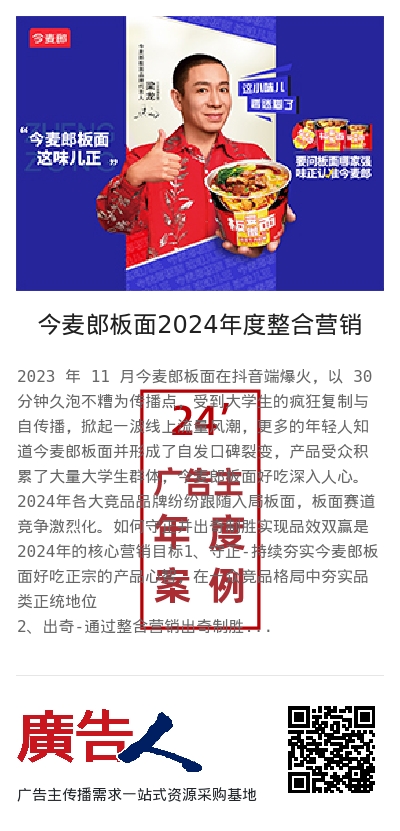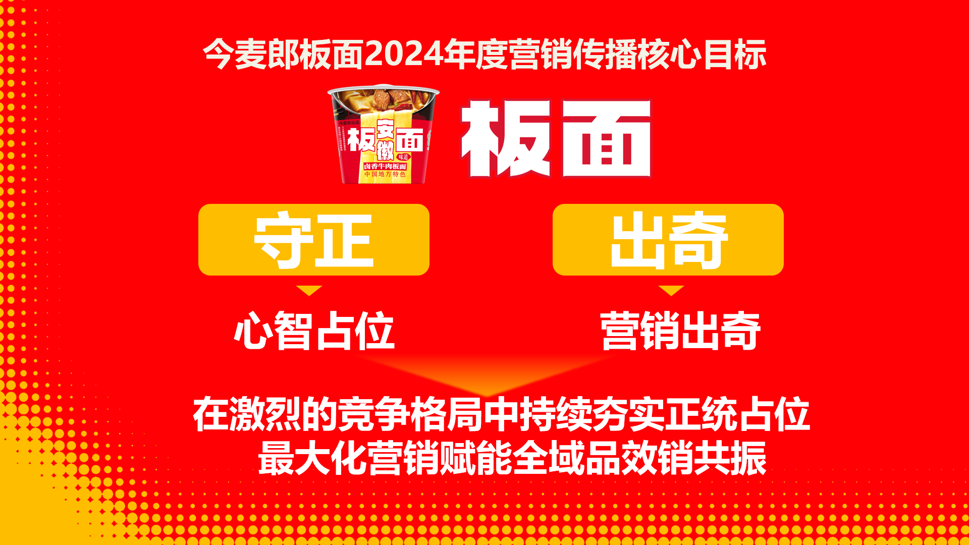 2023 年 11 月今麦郎板面在抖音端爆火,以 30 分钟久泡不糟为传播点,受到大学生的疯狂复制与自传播,掀起一波线上流量风潮,更多的年轻人知道今麦郎板面并形成了自发口碑裂变,产品受众积累了大量大学生群体,今麦郎板面好吃深入人心。2024年各大竞品品牌纷纷跟随入局板面,板面赛道竞争激烈化。如何守正并出奇制胜实现品效双赢是2024年的核心营销目标