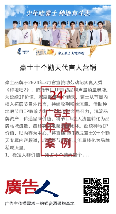 豪士品牌于2024年3月官宣赞助劳动纪实真人秀《种地吧2》,依托节目IP带动品牌声量销量暴涨。为延续IP价值,深度捆绑十个勤天,豪士从节目内植入拓展节目外代言,持续收割粉丝流量。