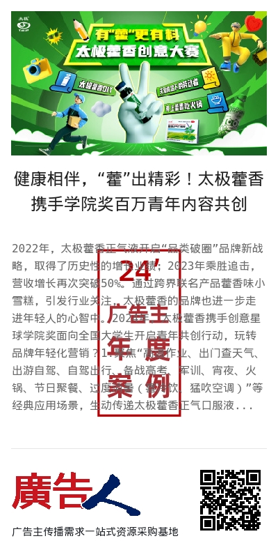 2022年,太极藿香正气液开启“品类破圈”品牌新战略,取得了历史性的增长业绩;2023年乘胜追击,营收增长再次突破50%。通过跨界联名产品藿香味小雪糕,引发行业关注,太极藿香的品牌也进一步走进年轻人的心智中。2024年,太极藿香携手创意星球学院奖面向全国大学生开启青年共创行动,玩转品牌年轻化营销?