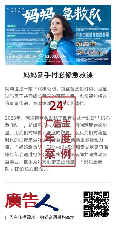 2023年,阿海德牵头发起了自有公益计划IP「妈妈急救队」,希望用广告人的力量,用创意策划的能量,用我们对媒体专业度的敬畏,以及我们对流量时代的把握来做好这个公益IP,帮助更多社会力量。「妈妈急救队」IP的核心概念和意义就是阿海德每年会通过组织公益机构、企业品牌共同推动公益事业,携手为妈妈们带去正能量。