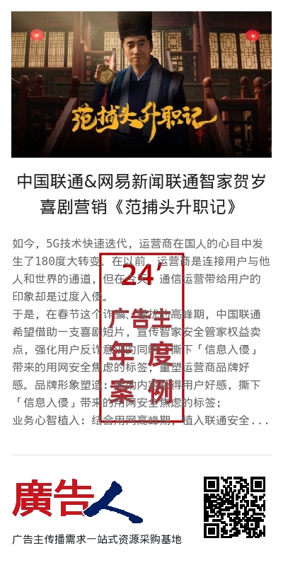 ①借助“熟人”,拉搞好感:国民捕头「范明」出演,借助“捕头”标识为联通智家守护能力代言。