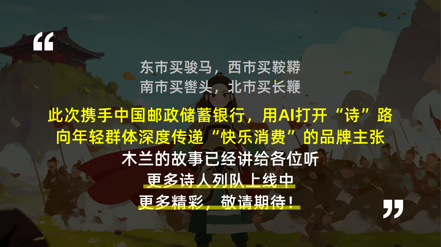 围绕「美好生活,快乐消费」的品牌主张,利用AIGC技术,让邮储银行置身中国传统诗词中,并在耳熟能详的古诗词中去赋予品牌的全新认知与政策解读。