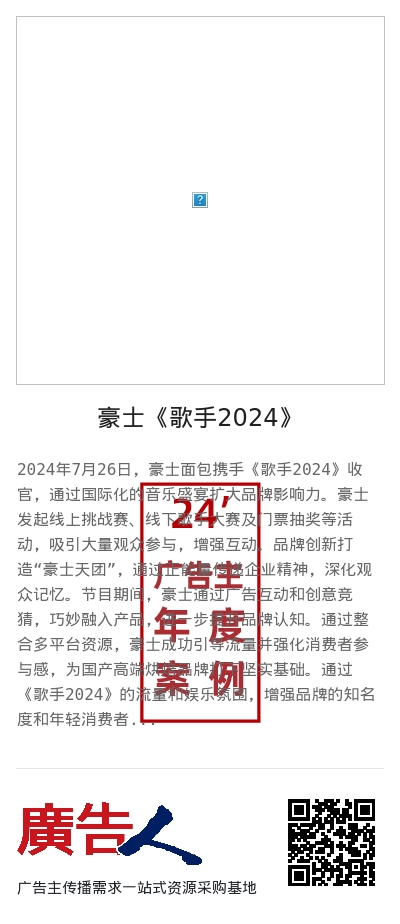2024年7月26日,豪士面包携手《歌手2024》收官,通过国际化的音乐盛宴扩大品牌影响力。豪士发起线上挑战赛、线下歌手大赛及门票抽奖等活动,吸引大量观众参与,增强互动。品牌创新打造“豪士天团”,通过正能量传递企业精神,深化观众记忆。节目期间,豪士通过广告互动和创意竞猜,巧妙融入产品,进一步提升品牌认知。通过整合多平台资源,豪士成功引导流量并强化消费者参与感,为国产高端烘焙品牌打下坚实基础。