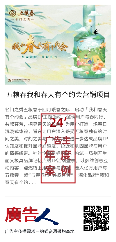 名门之秀五粮春于四月暖春之际,启动「我和春天有个约会」品牌IP主题活动,邀请用户与春同行,共叙芬芳,探寻春天的乐趣,为用户打造一场春日沉浸式体验,旨在让用户深入感受五粮春独有的时间之美、时刻之美与平衡之美。进一步达成品牌IP认知度和提升品牌好感度,拉近和巩固品牌与用户的情感纽带。