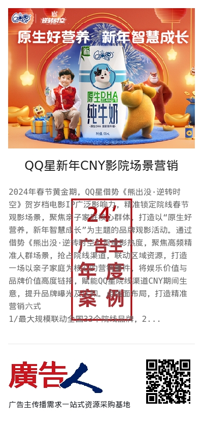 2024年春节黄金期,QQ星借势《熊出没·逆转时空》贺岁档电影IP广泛影响力,精准锁定院线春节观影场景,聚焦亲子家庭核心群体,打造以“原生好营养,新年智慧成长”为主题的品牌观影活动。