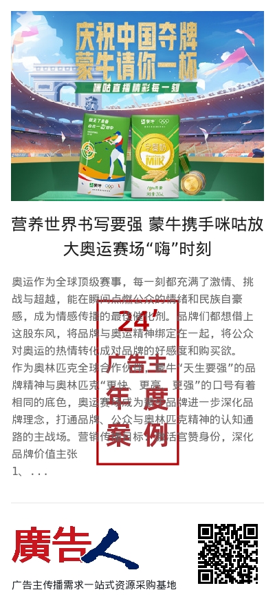 作为奥林匹克全球合作伙伴,蒙牛“天生要强”的品牌精神与奥林匹克“更快、更高、更强”的口号有着相同的底色,奥运赛场成为蒙牛品牌进一步深化品牌理念,打通品牌、公众与奥林匹克精神的认知通路的主战场。