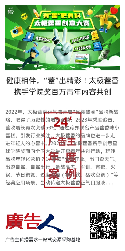 2022年,太极藿香正气液开启“品类破圈”品牌新战略,取得了历史性的增长业绩;2023年乘胜追击,营收增长再次突破50%。通过跨界联名产品藿香味小雪糕,引发行业关注,太极藿香的品牌也进一步走进年轻人的心智中。2024年,太极藿香携手创意星球学院奖面向全国大学生开启青年共创行动,玩转品牌年轻化营销?