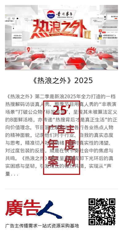 《热浪之外》第二季是新浪2025年全力打造的一档热搜解码访谈真人秀。整季节目用真人秀的“非表演场景”打破公众⼈物“标签茧房”,呈现其未被算法定义的B面鲜活⼈格,亦传递“热搜背后才是真正生活”的正向价值理念。