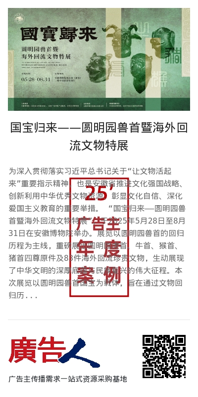 为深入贯彻落实习近平总书记关于“让文物活起来”重要指示精神,也是安徽省推进文化强国战略、创新利用中华优秀文物资源、彰显文化自信、深化爱国主义教育的重要举措。 “国宝归来——圆明园兽首暨海外回流文物特展”,于2025年5月28日至8月31日在安徽博物院举办。展览以圆明园兽首的回归历程为主线,重磅展出圆明园虎首、牛首、猴首、猪首四尊原件及83件海外回流珍贵文物,生动展现了中华文明的深厚底蕴与民族复兴的伟大征程。