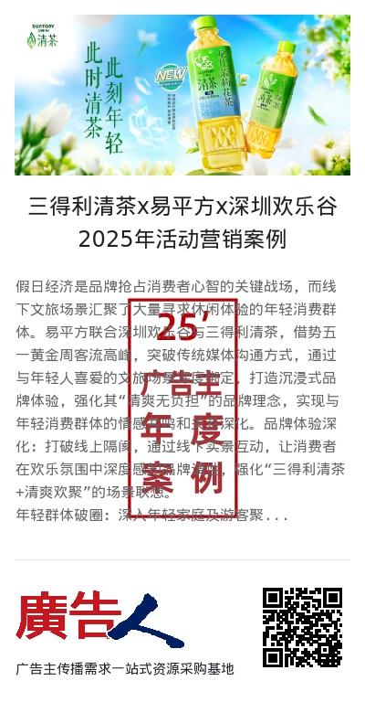 假日经济是品牌抢占消费者心智的关键战场,而线下文旅场景汇聚了大量寻求休闲体验的年轻消费群体。易平方联合深圳欢乐谷与三得利清茶,借势五一黄金周客流高峰,突破传统媒体沟通方式,通过与年轻人喜爱的文旅场景深度绑定,打造沉浸式品牌体验,强化其“清爽无负担”的品牌理念,实现与年轻消费群体的情感共鸣和关系深化。