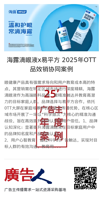 眼健康产品具有强需求导向和用户教育成本高的特点,其营销需在特定区域市场进行深度精耕。海露滴眼液作为高端眼科品牌,需精准触达并教育高潜力的目标家庭人群。品牌选择与易平方合作,依托OTT大屏在家庭场景中的沉浸式传播优势,在核心区域市场开展了一场以“科学频次”为核心的精准沟通战役,旨在高效提升品牌认知与用户信任。