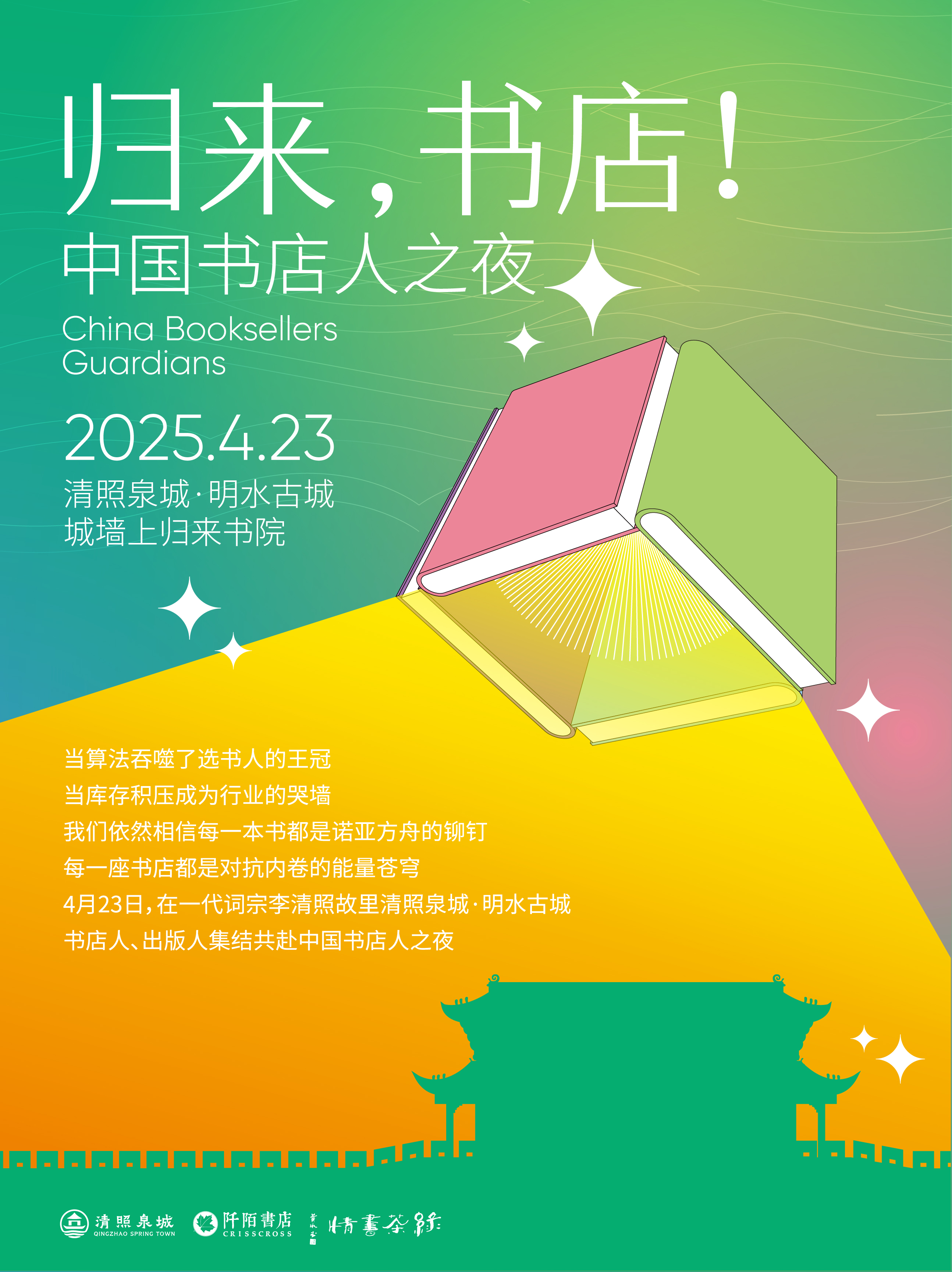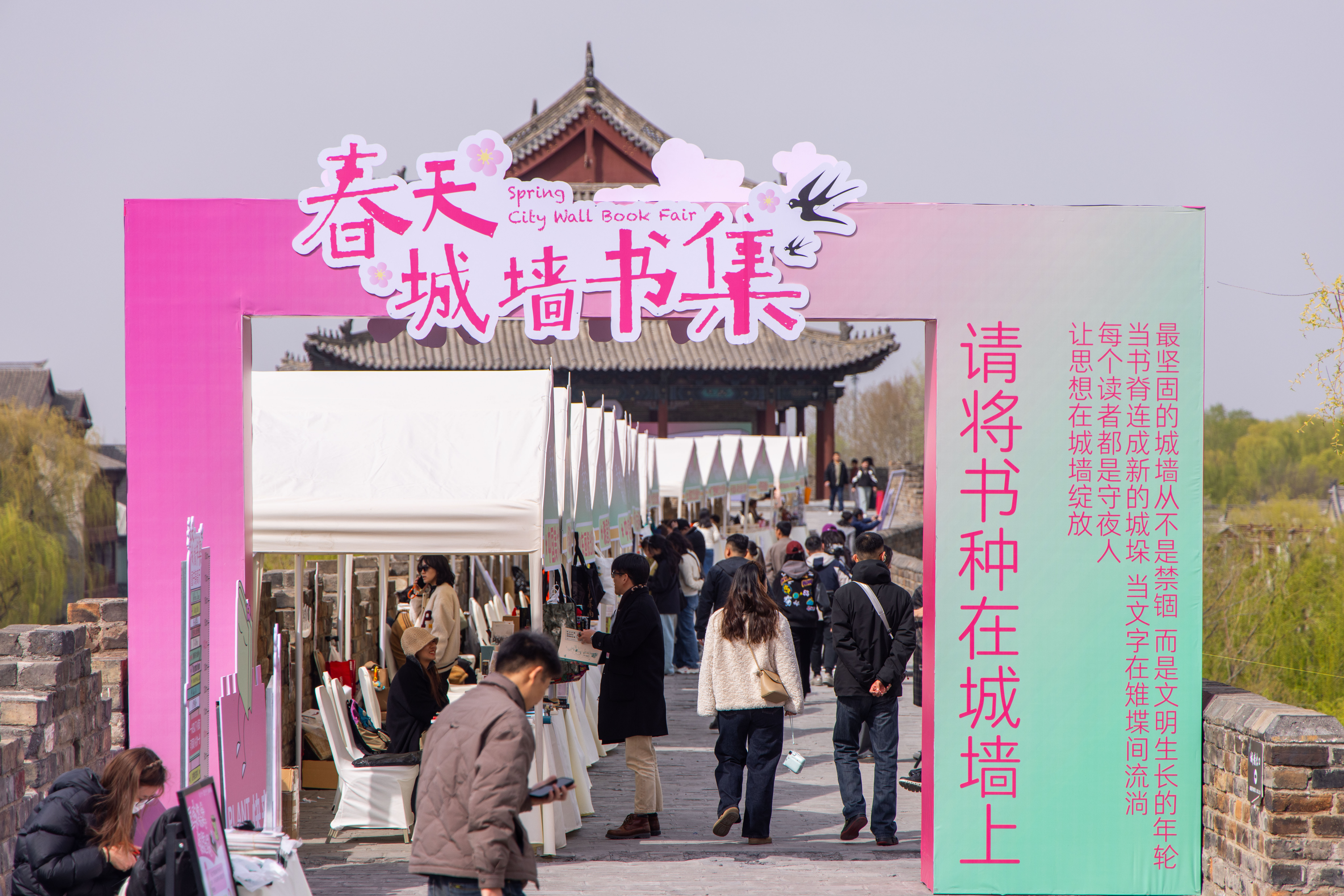 3月8日“姐妹书房”,联动全国58家品牌书店打造女性主题消费磁场。3月13日,李清照诞辰纪念日,全国首座城墙书店「归来书院」正式落户。3月28日至30日,以书为媒,以“春天城墙书集”为名,在城墙之上开启了一场「游园诗局」文化盛宴。4月23日,一场以书为媒的思想盛宴——“归来,书店!中国书店人之夜”圆满落幕。5月31日至6月2日,颠覆想象的“量子涟漪-清照电音节”于归来书院城墙之上,带来一场视觉和听觉实验革命。