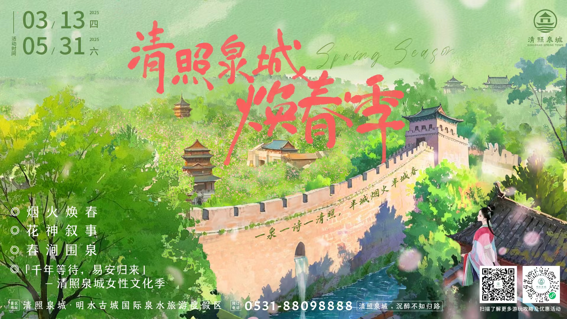3月13日,时值宋代词宗李清照诞辰之际,「归来书院」于济南清照泉城·明水古城国际泉水旅游度假区明水楼正式落地开业,以「千年等待,易安归来」为精神纽带,成为清照泉城春日文化活动「清照泉城焕春季」的特别活动「女性文化季」的重要组成部分。清照泉城焕春季活动着重李清照IP加持与女性的文化场景再造,通过文化场景构建、文字活化、数字艺术与当代美学的跨界碰撞,在青砖黛瓦的城墙空间中构建了一场跨越时空的文化盛宴。