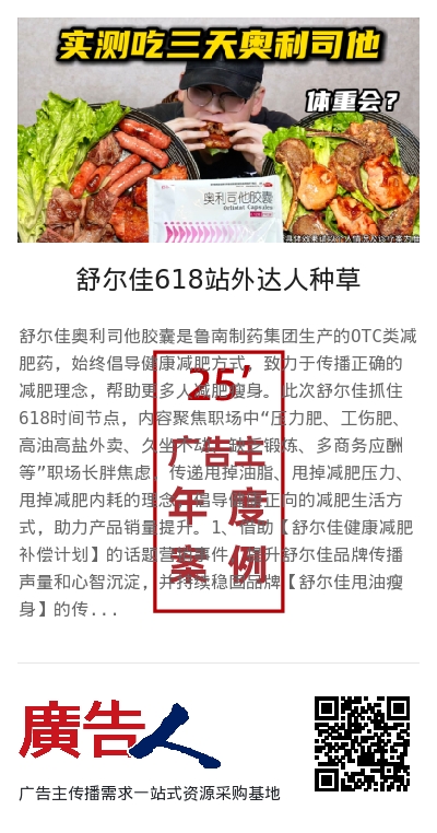 舒尔佳奥利司他胶囊是鲁南制药集团生产的OTC类减肥药,始终倡导健康减肥方式,致力于传播正确的减肥理念,帮助更多人减肥瘦身。此次舒尔佳抓住618时间节点,内容聚焦职场中“压力肥、工伤肥、高油高盐外卖、久坐不动、缺乏锻炼、多商务应酬等”职场长胖焦虑,传递甩掉油脂、甩掉减肥压力、甩掉减肥内耗的理念,倡导健康正向的减肥生活方式,助力产品销量提升。