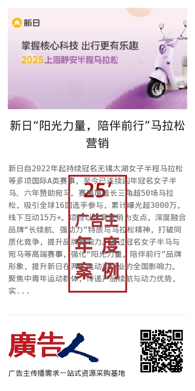 新日自2022年起持续冠名无锡太湖女子半程马拉松等多项国际A类赛事,至今已连续四年冠名女子半马、六年赞助宛马。赛事覆盖长三角超50场马拉松,吸引全球16国选手参与,累计曝光超3000万,线下互动15万+。项目以体育营销为支点,深度融合品牌“长续航、强动力”特质与马拉松精神,打破同质化竞争,提升品牌影响力。